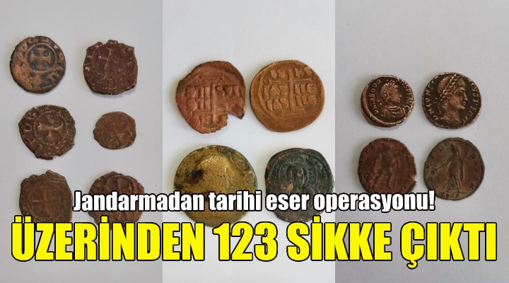 ?üphelinin yap?lan üst aramas?nda Bizans ve Roma dönemine ait oldu?u de?erlendirilen 123 adet bronz ve gümü? sikke ele geçirildi. Ele geçirilen tarihi eserler ?zmir Müze Müdürlü?ü'ne teslim edilirken, zanl?n?n adli i?lemlerinin devam etti?i ö?renildi.