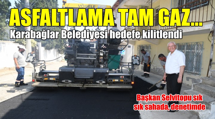 Karaba?lar Belediyesi'nin asfaltlama çal??malar? h?z kesmeden sürüyor. Asfalt serim sezonu olan yaz aylar?n? en iyi ?ekilde de?erlendirmek isteyen ekipler, ilçenin dört bir yan?nda, son teknoloji araçlarla asfaltlama yap?yor. Karaba?lar Belediye Ba?kan? Muhittin Selvitopu da s?k s?k ekipleri ziyaret ederek çal??malar? denetliyor ve bölgedeki vatanda?larla sohbet ediyor.