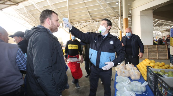 ?çi?leri Bakanl??? taraf?ndan pazaryerleriyle ilgili yay?nlanan son genelge kapsam?nda çal??malar da h?z kazand?. ?zmir Büyük?ehir Belediyesi, Karaba?lar Belediyesi, ?zmir Pazarc?lar Odas? ve G?da Mühendisleri Odas? ?zmir ?ubesi yöneticilerinden olu?an bir heyet, Bozyaka Pazaryeri'nde inceleme yapt?. Karaba?lar Belediyesi Zab?ta Müdürlü?ü ekipleriyle birlikte sabah?n erken saatlerinde ba?layan inceleme kapsam?nda, pazar tezgahlar?n?n aralar?n?n en az 3 metre aral?kl? olmas? için esnafa uyar?larda bulunuldu. Zorunlu olmayan ürünlerin sat???na izin verilmedi. Ayr?ca, aç?kta sat??? yap?lan zeytin gibi ürünlerin kapal? ortama al?nmas? istendi. Pazarc? esnaf?na, sat?? s?ras?nda eldiven ve maske takmalar? gerekti?i hat?rlat?ld?. Sebze ve meyvelerin do?rudan esnaf taraf?ndan, hijyen ko?ullar? dikkate al?narak po?etlenmesi konusunda uyar?larda bulunuldu. Pazaryerlerinin giri? ve ç?k??lar?na dezenfektan konulurken, esnafa da maske ve eldiven da??t?ld?. Ayr?ca esnaf?n ate?i de ölçüldü.