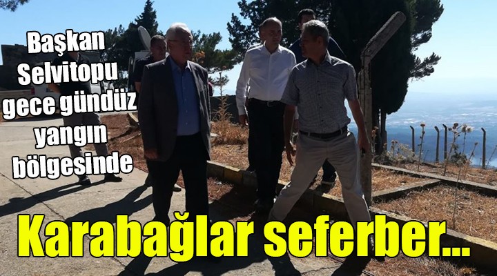 Karaba?lar Belediye Ba?kan? Muhittin Selvitopu da yang?n?n ç?kt??? bölgede gece-gündüz çal??malar? yerinden takip ediyor. Tar?m Bakan? Bekir Pakdemirli, ?zmir Valisi Erol Ayy?ld?z ile birlikte önceki gece de incelemelerde bulunan Ba?kan Selvitopu, bölge halk?na geçmi? olsun dile?inde bulundu.
