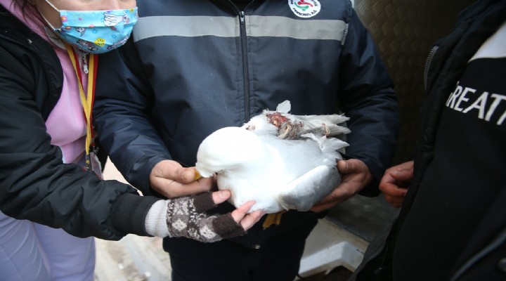 Kar??ya Belediyesi Veteriner ??leri Müdürlü?ü'ne ve ?zmir ?tfaiyesi'ne ba?l? ekipler, f?rt?na sonras? a?aca tak?lan mart?y? kurtard?.