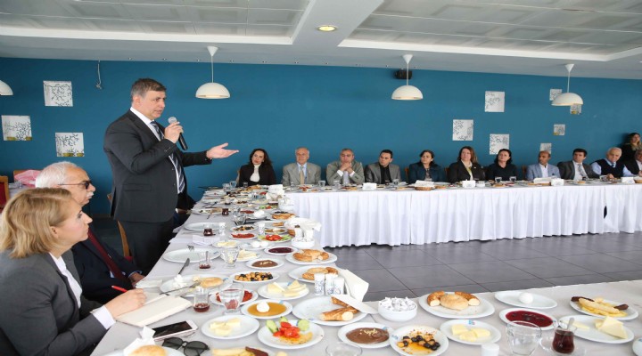 Kar??yaka Belediye Ba?kan? Cemil Tugay, 5 y?l boyunca kente birlikte hizmet edece?i muhtarlar ile kahvalt?da bir araya geldi. Ba?kan yard?mc?lar? ve bürokratlar?n da haz?r bulundu?u bulu?mada birlik ve beraberlik mesajlar? veren Tugay, ‘tüm mahallelere e?it hizmet’ ilkesiyle çal??acaklar?n? vurgulad?.
