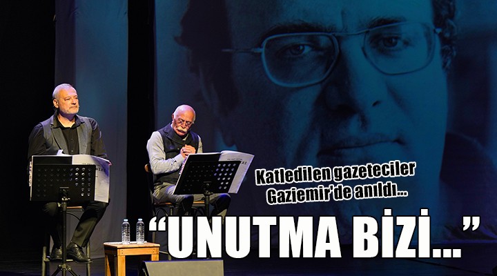 Gaziemir Belediyesi’nin Öldürülen Gazeteciler Günü kapsam?nda düzenledi?i etkinlikte, Unutma Bizi oyunu sahnelendi. Cengiz Toraman’?n yazd??? ve yönetti?i oyunu Levent Üzümcü Tiyatrosu oyuncular? Levent Üzümcü ile Orhan Ayd?n sahneledi. Solist Gülcan Altan ile Piyanist Dengin Ceyhan müzikleriyle oyuna renk katt?. Atatürk Kültür Merkezi’nde sahnelenen oyun, seyirciden tam not ald?. Oyuna yo?un ilgi gösteren Gaziemirliler, sanatç?lar? ayakta alk??lad?.