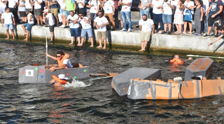 TMMOB ?zmir ?l Koordinasyon Kurulu taraf?ndan 1 Temmuz Denizcilik ve Kabotaj Bayram? nedeniyle düzenlenen 'Geleneksel TMMOB Karton Tekneler Yar???'n?n bu y?l 11'ncisi düzenlendi. Etkinlik, Alsancak Cumhuriyet Meydan?'nda yar??ma kat?l?mc?s? 14 meslek odas? üyesinin tekne yap?m çal??malar?yla ba?lad?. Her biri birbirinden yarat?c? konseptte haz?rlanan karton tekneleri tamamlamak için zamanla mücadele eden yar??mac?lar, yakla??k 3 saat süren tekne yap?m?n?n ard?ndan kortej e?li?inde Pasaport sahilindeki yar??ma alan?na yürüdü. Çalan düdükle yar??ma ba?lad?. Baz? tekneler h?zl?ca hareket ederek ilk andan itibaren ivmeyi yakalad?, baz?lar? ise suyun üstünde durmada büyük güçlük çekti. Kendi yapt?klar? teknelerde batan yar??mac?lar heyecanl? dakikalar ya?ad?. ?zmir Büyük?ehir Belediye Ba?kan? Tunç Soyer’in de kat?l?m?yla gerçekle?en etkinlikte, izleyiciler yar??ma anlar?n? cep telefonlar?na kaydetti. Yar???n ard?ndan Cumhuriyet Meydan?'nda ödül töreni gerçekle?irken, ilk batan tekneyi yapan Orman Mühendisleri Odas? Titanik ödülünü, en temiz çal??an ekip olarak Çevre Mühendisleri Odas? Mavi Bayrak ödülünü, en sportmen ekip olarak Harita ve Kadastro Odas? Centilmenlik ödülünü, ?ç Mimarlar Odas? ise en iyi tasar?m ödülünü ald?. En iyi kostüm ödülünü Maden Mühendisleri Odas? ald?. Yar??mada, Ziraat Mühendisleri Odas? üçüncülük ödülünü al?rken, Maden Mühendisleri Odas? ikinci, Gemi Mühendisleri Odas? ise birinci oldu. Öte yandan, yar??man?n ard?ndan karton toplayan küçük çocuklar?n tekneleri çöp kutular?na do?ru sürükleyip içlerinde e?lenmesi de yüzleri gülümsetti.
