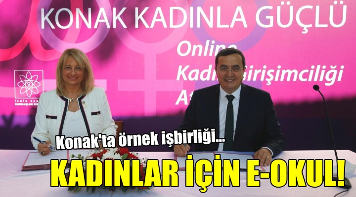 Konak’ta kad?nlar için ‘e-okul’ dönemini ba?latacak i?birli?inin protokolü, Konak Belediyesi Basmane Semt Merkezi’nde düzenlenen törenle imzaland?. Protokole, Konak Belediye Ba?kan? Abdül Batur ile ?zmir Kad?n Kurulu?lar? Birli?i Ba?kan? Huriye Serter imza att?. Birli?e üye derneklerin yöneticileri de törene kat?ld?.