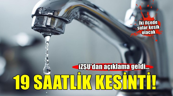 ?zmir Su ve Kanalizasyon ?daresi Genel Müdürlü?ü'nden (?ZSU) yap?lan aç?klamada, Halkap?nar Arsenik Ar?tma Tesisi giri?indeki çelik boru hatlar?n?n ba?lant? çal??malar? nedeniyle 4 A?ustos Pazartesi günü saat 09:00 ile 5 A?ustos Sal? günü saat 04:00 aras?nda su kesintisi olaca?? belirtildi.