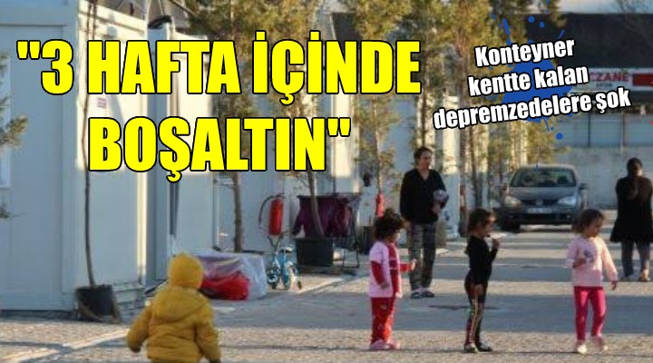 Konteyner Kent’te ikamet etmekte olan tüm depremzedeler 22.06.2022 tarihinden itibaren aranarak 3 hafta içinde konteyner kentten ayr?lmalar? gerekti?i söylenmi?tir. AFAD Konteyner Kent Yönetimi taraf?ndan konteyner kentin 2022 y?l? Temmuz ay?nda sonunda tamamen bo?alt?laca?? belirtilmi?tir. 3 haftal?k süre zarf?nda ev bulman?n zorlu?u yan?nda yüksek kira, depozito ve nakliye bedelini birçok aile temin edemeyecek ve ma?dur olacakt?r. Konaklama merkezimizin geçici oldu?unu kabul etmekle birlikte, zaten evini kaybederek ma?dur durumda olan yurtta?lar?m?z? daha fazla ma?dur etmemek ad?na konaklama sürecinin en az?ndan 1 y?l daha uzat?lmas?n? talep etmekteyiz.