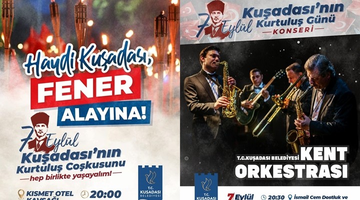 7 Eylül Ku?adas?’n?n dü?man i?galinden kurtulu?u kutlamalar?, sabah saat 09.45’te Hükümet Kona??’nda esareti temsil eden k?z çocu?unun Efeler taraf?ndan kurtar?l???n? anlatan canland?rma ile ba?layacak. Saat 10.00’da Atatürk Meydan?’nda çelenk töreni ve resmi kutlamalar ile devam edecek kurtulu? günü kutlamalar?, saat 19.30’da Ku?adas? Belediyesi taraf?ndan düzenlenecek olan fener alay? ile devam edecek. K?smet Otel kav?a??ndan ba?layacak olan fener alay?, ?smail Cem Dostluk ve Bar?? Meydan?’nda gerçekle?ecek olan Ku?adas? Belediyesi Kent Orkestras? konseri ile sona erecek.