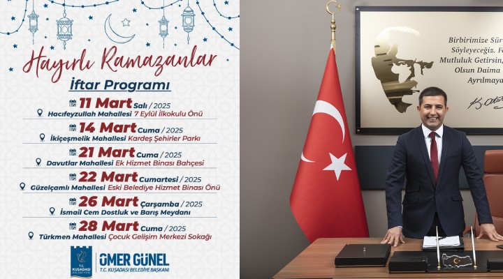 Ramazan ay?n?n bereketini payla?mak için Ku?adal?lar? kuracaklar? iftar sofralar?na davet eden Ku?adas? Belediye Ba?kan? Ömer Günel, “Öncelikle tüm hem?ehrilerime sevdikleriyle bir arada olduklar? sa?l?kl?, huzurlu ve bereketli bir Ramazan ay? diliyorum. "Ramazan birli?in ve beraberli?in ay?d?r. Dayan??may? ve bereketi birlikte büyütece?iz" diye konu?tu.