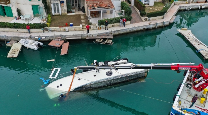 Yat?n vince ba?l? özel halatlarla bir miktar kald?r?lmas?n?n ard?ndan dalg?ç pompalarla su tahliyesi yap?ld?. ?çindeki suyun bo?alt?lmas?yla yat, su üstüne ç?kmaya ba?lad?.