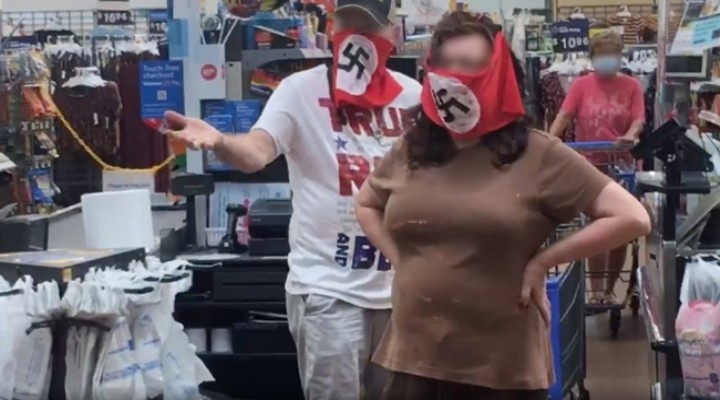Çiftin Nazi sembolü maskeleri ile görüntüleri, ailesi Nazilerle sava?m??, Almanya do?umlu Raphaele Mueller taraf?ndan cep telefonu ile internette payla??ld?.