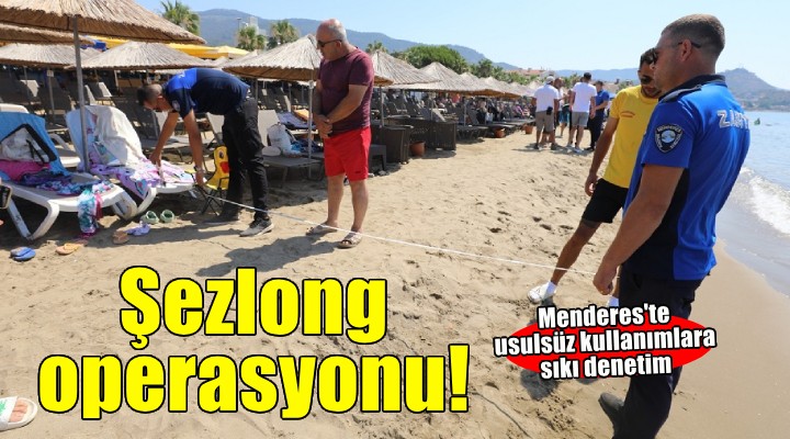 Menderes Belediyesi, korsan ?ezlonglara kar?? operasyon ba?latarak toplatma ve ceza i?lemi uygulad?. Zab?ta Müdürlü?ü’ne ba?l? ekipler sahil ?eridi boyunca ani denetimler yaparak korsan kullan?m? tespit ediyor. Duruma an?nda müdahele edilerek ?ezlonglara el koyuluyor.