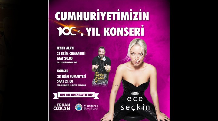 29 Ekim 100. Y?l Cumhuriyet Ko?usunun ard?ndan etkinlikler fener alay? ile devam edecek. Menderes Belediyesi önünden ba?lay?p Menderes 19 May?s Stad?’nda sona erecek fener alay?n?n ard?ndan statta Ersin ?ov gerçekle?ecek. Ersin ?ovun ard?ndan ise cumhuriyet co?kusu Ece Seçkin ile taçlanacak.