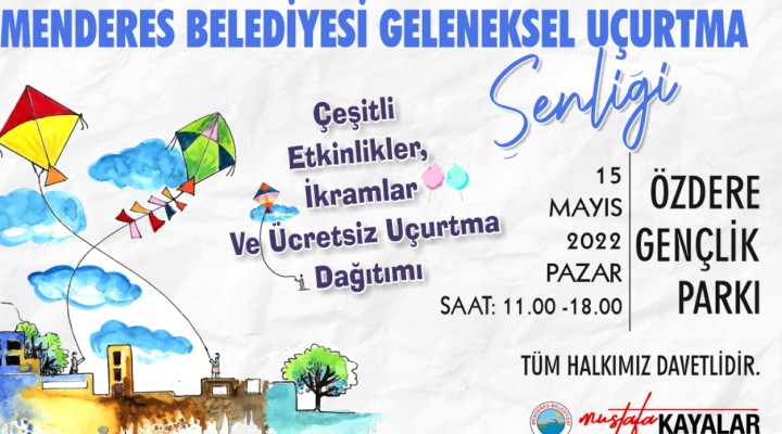 Menderes Belediyesi Geleneksel Uçurtma ?enli?i hakk?nda bilgi veren Belediye Ba?kan? Mustafa Kayalar, pandemiden dolay? birçok etkinli?i ertelemek zorunda kald?klar?n? belirterek, “Pandeminin gölgesinde zorlu 2 y?l? geride b?rakt?k. Önümüzdeki süreçte festivallerimize ve ?enliklerimize kald???m?z yerden devam edece?iz. Özdere Orta Mahalle Gençlik Park?m?zda gerçekle?ecek ?enli?imizde, çocuklar?m?z ?i?me oyun parklar?yla e?lenirlerken, gün boyu çe?itli etkinliklerle e?lenceli bir Pazar aktivitesi yapm?? olacaklar. ?enlik alan?m?zda gün boyu ücretsiz pamuk ?eker ve macun ?ekeri da??t?larak çocuklar?m?za eski sokak kültürünü tekrardan ya?atmay? amaçl?yoruz. Çocuklar?m?z geleneksel lezzetleri tadarlarken ücretsiz da??taca??m?z 5 bin uçurtma ile de hayallerini gökyüzüne ta??m?? olacaklar” dedi.