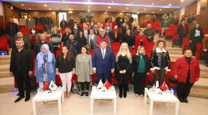 Menderes Belediyesi Kültür ve Sosyal ??ler Müdürlü?ü'nün haz?rlad??? etkinlik kapsam?nda salondaki kad?nlara, KA.DER ?zmir ?ube Üyesi Prof. Dr. Gülgün Erdo?an Tosun ve Menderes Belediyesi Kad?n Dayan??ma birimi personelleri kad?n haklar? ile ilgili sunum yapt?.