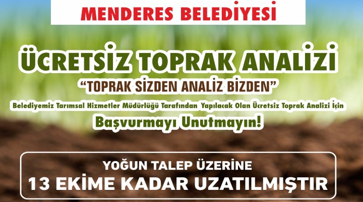 Ücretsiz toprak analizi projesine talebin yo?un olmas?n?n önemli oldu?unu kaydeden Menderes Belediye Ba?kan V. Erkan Özkan, ‘’ ?lçemizin bereketli topraklar?nda üretim yapan tüm üreticilerimizin her zaman yan?nday?z. Projemize olan yo?un ilgi ne kadar önemli bir çal??ma gerçekle?tirdi?imizin de kan?t?. Yo?un talep nedeniyle projemizin son ba?vuru tarihini 13 Ekim Cuma gününe kadar uzatma karar? ald?k. Bütün üreticilerimiz ücretsiz gerçekle?tirdi?imiz toprak analizimizden yararlanabilir. Amac?m?z çiftçimizin, üreticimizin ekme?ini büyütmek, bereketli topraklar?m?z?n daha verimli kullan?m?n? sa?lamak. Üreticimizin her zaman yanlar?nda ve destekçileriyiz. Bu kapsamda projede bize katk? sa?layan ?zmir Büyük?ehir Belediyesi’ne de Menderesli çiftçilerimiz ad?na te?ekkür ediyorum’’ dedi.