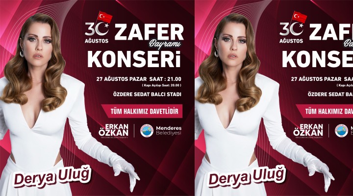 Menderes Belediyesi taraf?ndan 30 A?ustos Zafer Bayram?’n?n 101. y?l dönümü kapsam?nda Derya Ulu? konseri düzenlenecek. 27 A?ustos Pazar günü saat 21.00’da gerçekle?ecek etkinlik Özdere Sedat Balc? stad?nda yap?lacak.