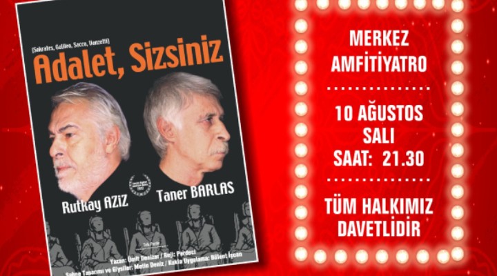 Menderes Belediyesi Kültür ve Sosyal ??ler Müdürlü?ü taraf?ndan düzenlenen Kültür Sanat Günleri kapsam?nda usta oyuncular Rutkay Aziz ve Taner Barlas’?n performans?yla Adalet Sizsiniz oyunu Menderes’te sahne alacak.