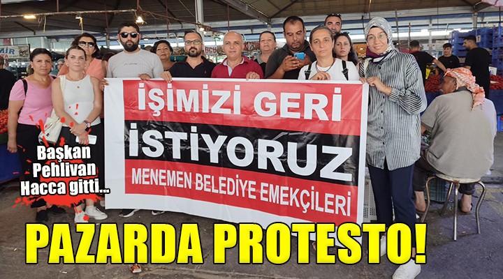 Menemen Kent 2 Pazaryeri'nde ellerinde "??imizi geri istiyoruz" yaz?l? pankartla yürüyen i?çiler "Hak, hukuk, adalet" slogan? att?. ??çiler aç?klamas?nda muhatap bulamad?klar?n? Menemen Belediye Ba?kan? Ayd?n Pehlivan'?n Hacca gitti?ini söyledi.