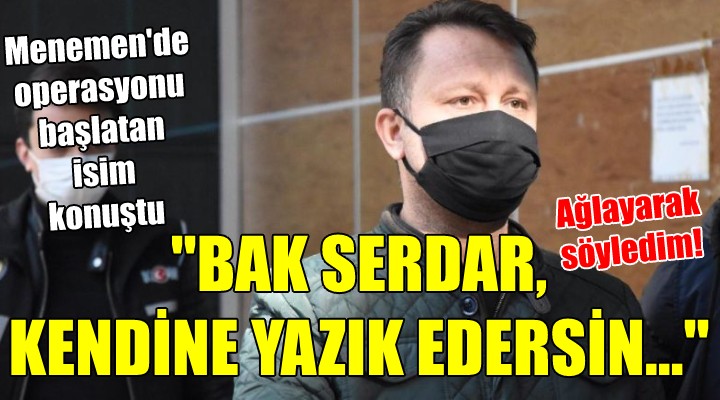 Asla bir husumetim yoktu. Dosyay? karartmam?? olsalard? Savc?l??a gitmezdim, çünkü sorumluluk onlarda olurdu. Ben devlet memuruyum. Zan alt?nda kalacakt?m. E?er bunlar? bildirmesem suç i?lemi? olurdum. Ben 5-6 ay önce, bu rapor olaylar? olmadan önce, gördü?üm-duydu?um ?eyler üzerine; Serdar Aksoy’un makam?nda kendisiyle konu?tum. Hatta gözya?lar?ma hakim olamad?m. ‘Bak Serdar’ dedim, ‘Yaz?k günah, çolu?un çocu?un var, kendine yaz?k edersin, seni uçuruma do?ru götürüyorlar.’ dedim. Gözlerimden ya?lar akt?, gözünün önünde a?lad?m. Ona üzüldüm çünkü. ??in do?rusu, ekibi Serdar Aksoy’u bu hale soktu. Sadece Serdar Aksoy de?il, benim Menemen’de hiç kimse ile bir husumetim olmad?.
