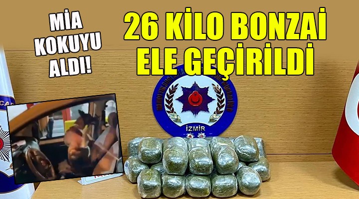 SONKALE?ZM?R-?zmir ?l Emniyet Müdürlü?ü Narkotik Suçlarla Mücadele ?ube Müdürlü?ü ve ?stihbarat ?ube Müdürlü?ü ekipleri, Kemalpa?a Akalan otoban gi?elerinde Narkotik köpe?i Mia'n?n koku almas? üzerine durdurulan bir araçta arama yapt?. Aramada araç içerisindeki çantalarda 26 kilo 140 gram bonzai adl? uyu?turucu madde ele geçirildi. Gözalt?na al?nan araçtaki 2 ?ah?s, sevk edildikleri mahkemece tutukland?.