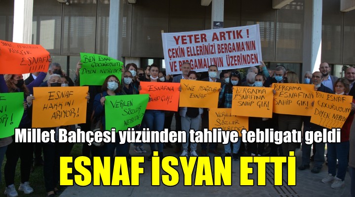 Bergama Belediyesi’nin "depreme kar?? dayan?ks?z ve riskli" notuyla yollad??? tahliye yaz?lar?n?n ard?ndan aya?a kalkan neye u?rad???n? ?a??ran stat esnaf?, önce kepenk kapatma eylemi yapt?. 60 gün içinde i?yerlerinden ç?kmalar? istenen 86 esnaf, daha sonra Bergama Belediyesi'nin bütçe görü?melerinin yap?ld??? meclis toplant?s? salonuna geçti. Toplant?n?n yap?ld??? kültür merkezi önünde bir bas?n aç?klamas? yapan yöre esnaf?, "Esnaf hakk?n? ar?yor!”, “Verilen sözler nerede?”, “Yine ma?dur esnaf!”, “Esnafa sahip ç?k”, “Ben esnaf çocu?uyum diyen nerede?” ve “Bergama esnaf?na sahip ç?k” dövizleri ta??d?. Tepkili esnafa CHP ve ?Y? Parti ilçe te?kilatlar? ile belediye meclis üyeleri, oda ba?kanlar? ve Bergama Demokrasi Platformu üyeleri de destek verdi.