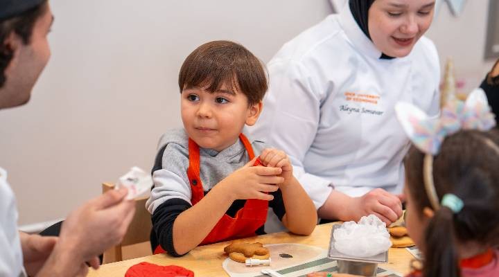 Y?lba?? temas?na özel olarak kar tanesi, baston ?emsiye, kardan adam ve y?lba?? ?apkas? gibi farkl? ?ekillerde kurabiyeler yapan çocuklar, gönüllerince bir gün geçirdi. Pastac?l?k dersi e?itmen ?efi Ece Eryener’in rehberli?inde, Gastronomi ve Mutfak Sanatlar? Bölümü ö?rencileriyle çal??arak renkli ?eker hamurlar?na ?ekil veren, birbirlerinin kurabiyelerini süsleyen ve merak ettiklerini soran çocuklar, e?lenirken ö?renme f?rsat? buldu.