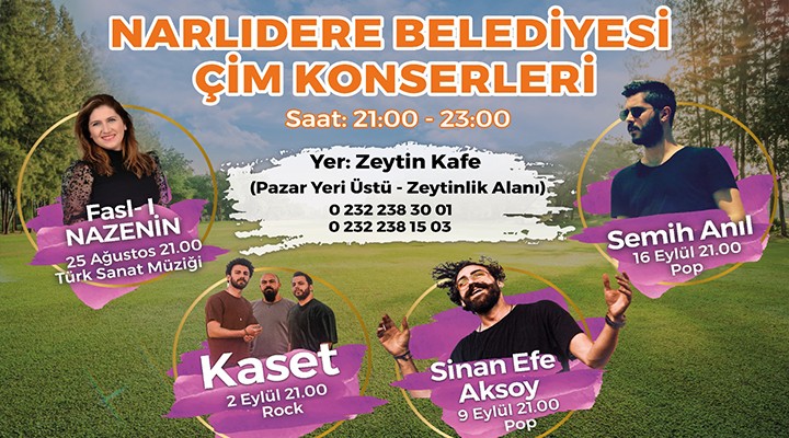 Narl?dere Belediyesi’nin bu y?l ilk kez düzenleyece?i Çim Konserleri, pazar yerinin üst k?sm?ndaki zeytinlik alanda yeni yap?lan Zeytin Kafe’nin bahçe alan?nda 21.00- 23.00 saatleri aras?nda yap?lacak. ?lk konser 25 A?ustos Çar?amba günü (yar?n) gerçekle?ecek ve Türk Sanat Müzi?inin sevilen ismi Fasl-? Nazenin sahne alacak. 2 Eylül Per?embe günü Kaset grubu rock konseri verecek. 9 Eylül Per?embe günü pop müzi?inin sevilen sesi Sinan Efe Aksoy sahne alacak. 16 Eylül’de de Semih An?l çim konserlerinin kapan???n? yapacak.