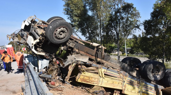 kaza, sabah saatlerinde ?zmir-Çe?me Otoyolu Narl?dere yol ayr?m?nda meydana geldi. Balçova'dan Narl?dere yönüne seyir halinde olan Ercan Y?ld?r?m, yönetimindeki 35 AK 9811 plakal? suni çim yüklü kamyonun direksiyon kontrolünü yitirdi. Bariyerleri a?an kamyon, ?arampole devrilerek ters döndü. Kazay? görenlerin durumu bildirmesi üzerine kaza yerine gelen sa?l?k ekiplerinin yapt??? kontrolde, Y?ld?r?m’?n hayat?n? kaybetti?i belirlendi. Polis otoyolda ba?ka bir kaza ya?anmamas? için önlem al?rken, sürücünün cans?z bedeni kamyonun kasas?n?n alt?ndan ç?kar?ld?. Savc?n?n yapt??? incelemenin ard?ndan Y?ld?r?m’?n cesedi otopsi için ?zmir Adli T?p Kurumu morguna kald?r?ld?. Kazayla ilgili soru?turma ba?lat?ld?.