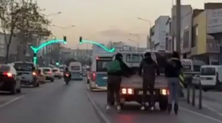 SONKALE?ZM?R-Olay önceki gün ak?am saatlerinde ?zmir'in Gaziemir ilçesinde ya?and?. ?zmir'den Gaziemir yönüne gitmekte olan bir kamyonetin kasas?na tutunarak yolculuk eden patenli 3 genç trafikte büyük tehlike yaratt?. Trafi?in yo?un oldu?u saatlerde ya?anan olayda 3 genç, seyir halindeki kamyonetle birlikte bir süre yolculuk etti. Korku dolu onlar bir yurtta? taraf?ndan anbean görüntülenirken, olayda ?ans eseri kimse yara almad?.