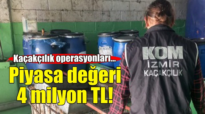 ?zmir ?l emniyet Müdürlü?ü'ne ba?l? ekipler 29 Aral?k - 4 Ocak tarihleri aras?nda 26 operasyon yapt?. Operasyonlarda piyasa de?eri yakla??k 4 milyon TL olan kaçak akaryak?t, etil alkol ve tütün ürünü ele geçirildi.