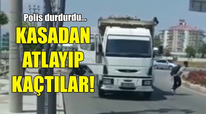 ?zmir'deki kaçak göçmen vakalar?na bir yenisi daha eklendi. Saat 14:30 s?ralar?nda uygulama yapan polis ekibi ?üphelendikleri bir kamyonu durdurdu. Arac?n durmas?yla kasadan atlayan kaçak göçmenler ko?arak bölgeden uzakla?maya ba?lad?.