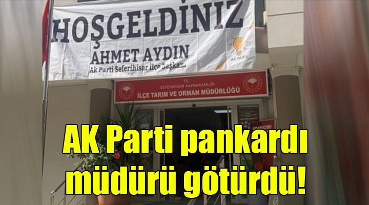 ?zmir'in Seferihisar ?lçesi'nde tart??ma yaratan olay geçen ekim ay?nda ya?and?. AK Parti Kad?n Kollar? ilçe kongresi için ?lçe Tar?m ve Orman Müdürlü?ü binas?ndaki salon belirlendi. Kongrenin yap?laca?? gün, salonun bulundu?u il müdürlü?ü binas?n?n giri?ine, AK Parti amblemi ve AK Parti ?lçe Ba?kan? Ahmet Ayd?n'?n isminin yer ald??? "Ho?geldiniz" yaz?l? pankart as?ld?. Bir kamu binas?na as?lan bu siyasi parti pankart?, ?zmir'de tart??ma yaratt?. Çok say?da CHP'li siyasetçi ve baz? yurtta?lar bu duruma tepki gösterdi.