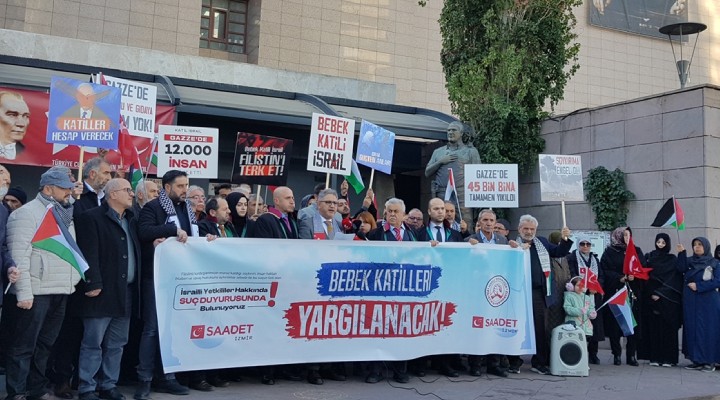 Aç?klaman?n ard?ndan, Saadet Partisi ?zmir ?l Ba?kanl??? taraf?ndan Cumhuriyet Ba?savc?l???na suç duyurusu dilekçesi sunuldu. Dilekçede, ?srail devlet yöneticilerin, "soyk?r?m", "kasten öldürme", "kasten yaralama", "sava? ve sald?r? suçlar?", "insanl??a kar?? suçlar", "ki?iyi hürriyetinden yoksun k?lma", "konut dokunulmazl???n?n ihlali" gibi suçlardan cezaland?r?lmalar? talep edildi.