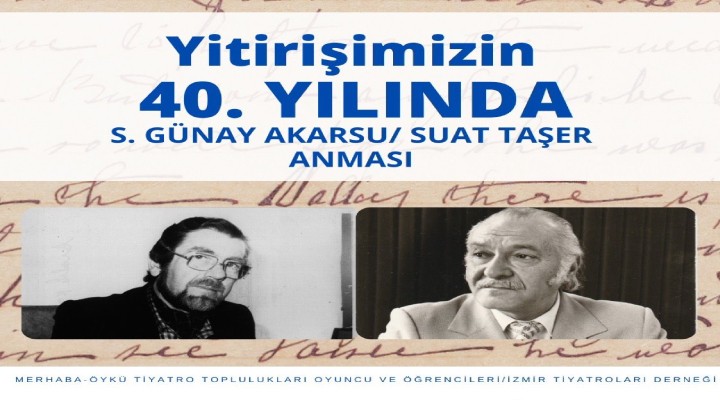 ?zmir Büyük?ehir Belediyesi tiyatro ele?tirmeni, yay?nc? Sabri Günay Akarsu ile tiyatro oyuncusu, ?air, çevirmen Suat Ta?er’i vefatlar?n?n 40. y?l?nda anacak. Merhaba - Öykü Tiyatro Topluluklar? ve ?zmir Tiyatrolar? Derne?i i?birli?i ile düzenlen anma program? 26 May?s 2022 Per?embe günü saat 19.00’da Tarihi B?çakç? Han’da yap?lacak. Organizasyon ve sunumunu ?zmir Tiyatrolar? Derne?i Yönetim Kurulu ve ?zmir Büyük?ehir Belediyesi ?ehir Tiyatrolar? Dan??ma Kurulu Üyesi Bilgehan O?uz’un yapaca?? programda Orhan Kazbek, Özgür Ba?kaya, Huriye Ta?er, Deniz Üstüngel, Hüseyin Yurtta?, Müjde Bilir, Galip Çevik, Emel Aksayl?, Yücelay Sal, Doç. Dr. Efdal Sevinçli, Prof. Dr. Murat Tuncay Suat Ta?er ve Sabri Günay Akarsu’nun 70’li ve 80’li y?llarda ?zmir’de tiyatro alan?nda yapt??? çal??malar? aktaracak.