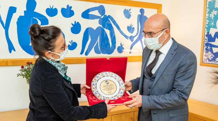 SES yöneticileri Ba?kan Soyer'e te?ekkür plaketi ile üzerinde pandemiyle mücadele ederken hayat?n? kaybeden sa?l?kç?lar?n foto?raflar?n?n yer ald??? masa takvimini verdi.
