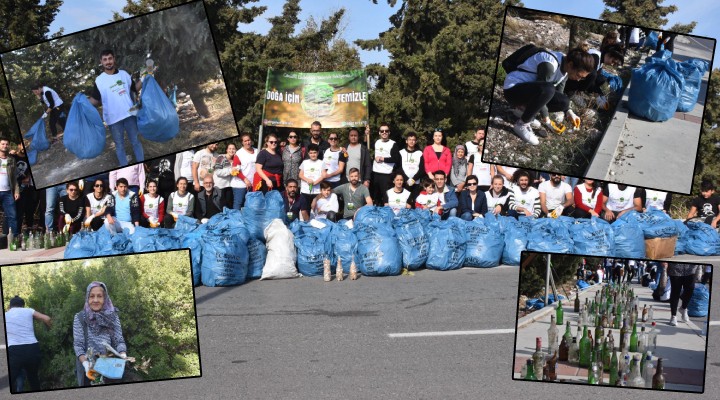Sosyal medya üzerinden organize olan ve hemen her hafta ?zmir'de bir ormanl?k alandaki çöpleri temizleyen 'Do?a ?çin Temizle' grubu, Buca'da bulunan ?ahin Tepesi'nde temizlik yapt?. 50 ki?inin kat?ld??? etkinlikte, ormandaki çöpler tek tek topland?. Sabah saatlerinde ba?layan temizleme çal??malar?nda yüzlerce alkol ?i?esi, plastik at?klar, araba lastikleri ve ayakkab? gibi orman? kirleten maddeler topland?. Toplanan çöpler aras?nda en yayg?n olan ise alkol ?i?eleri ve izmaritler oldu. Yüzlerce alkol ?i?esi, on binlerce de izmarit, temizlendi.