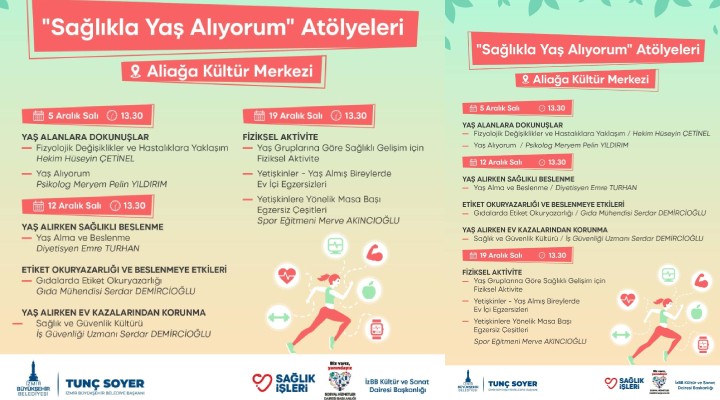 Alia?a Kültür Merkezi (21 Kas?m 2023- Saat 10:30): “Ya? alanlara dokunu?lar”-Fizyolojik De?i?iklikler ve Hastal?klara Yakla??m-Hekim Hüseyin Çetinel, “Ya? Al?yorum”- Psikolog Meryem Pelin Y?ld?r?m, “Ya? al?rken sa?l?kl? beslenme” - Ya? Alma ve Beslenme - Diyetisyen Emre Turhan, “Fiziksel Aktivite”, “Ya? Gruplar?na Göre Sa?l?kl? Geli?im için Fiziksel Aktivite - Spor E?itmeni Merve Ak?nc?o?lu.