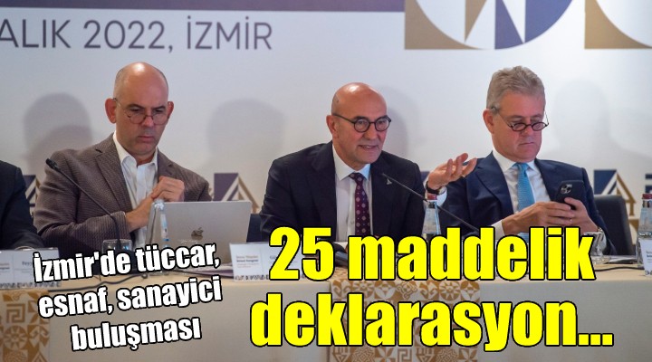 ?zmir Büyük?ehir Belediyesi taraf?ndan “Gelece?in Türkiyesi’ni in?a ediyoruz” slogan?yla ?ubat 2023’te ?zmir’de düzenlenecek ?kinci Yüzy?l?n ?ktisat Kongresi haz?rl?k çal??malar? kapsam?nda yap?lan son payda? bulu?mas?n?n ard?ndan sonuç bildirgesi aç?kland?. ?zmir Büyük?ehir Belediye Ba?kan? Tunç Soyer, sanayi, ticaret ve esnaf odalar?n?n temsilcilerinin kat?ld??? Swissotel Büyük Efes’teki toplant?n?n ard?ndan 25 maddelik deklarasyonu kamuoyu ile payla?t?.