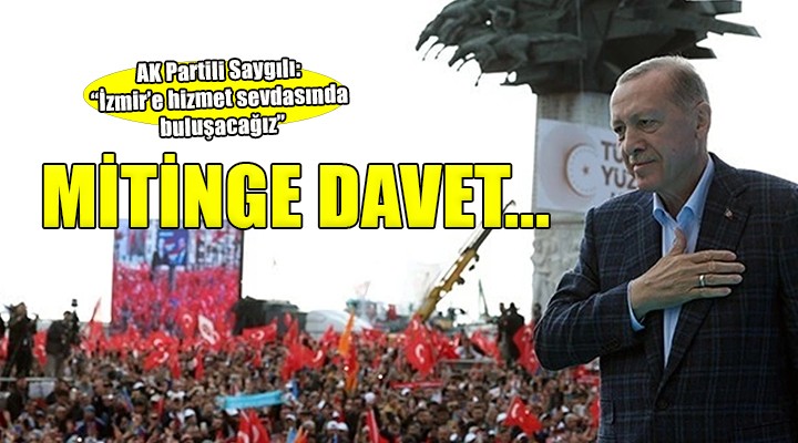 AK Parti ?zmir ?l Ba?kan? Bilal Sayg?l?; Cumhurba?kan? Recep Tayyip Erdo?an’?n kat?l?m?yla gerçekle?ecek '?zmir Mitingi'ne tüm ?zmirlileri davet etti. Pazar günü, Saat 12.30’da Gündo?du Meydan?’nda ?zmirlilerin ve ?zmir’e hizmet sevdas?yla yan?p tutu?anlar?n bulu?ma günü olaca??n? söyleyen Ba?kan Sayg?l?; “Gerçek ?zmir sevgisi ve ?zmir için ta? üstüne ta? koymak için sab?rs?zlananlar?n heyecan?, inan?yorum ki yar?n tek yumruk, tek yürek olacak" dedi.