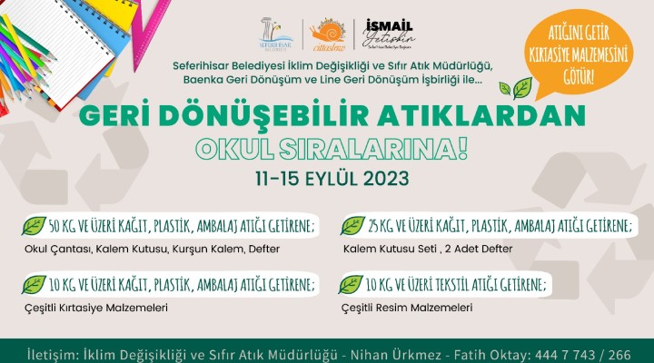 Seferihisar Belediyesi ?klim De?i?ikli?i ve S?f?r At?k Müdürlü?ü, Baenka Geri Dönü?üm ve Line Geri Dönü?üm i?birli?iyle, gençlerde s?f?r at?k bilincini artt?rmak amac?yla önemli bir projeyi hayata geçiriyor. “Geri Dönü?ebilir At?klardan Okul S?ralar?na” slogan?yla yola ç?kan belediye, 11-15 Eylül tarihleri aras?nda “At???n? Getir, K?rtasiye Malzemesini Götür” kampanyas? ba?latt?.