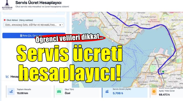 ?zmir Büyük?ehir Belediyesi, 2025-2026 e?itim ö?retim y?l? öncesinde velilerin okul servis ücretlerini hesaplayabilmeleri için web sitesi haz?rlad?. Ö?rencinin al?naca?? konum, gidece?i okul ve  mesafeye göre servis ücretinin hesaplanabildi?i https://servisucrethesaplama.izmir.bel.tr web adresi, velilere büyük kolayl?k sa?layacak.