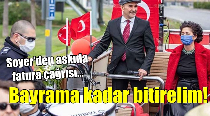 ?zmir'de bir süre önce ba?lat?lan Ask?da Fatura kampanyas?yla ilgili de konu?an Soyer, "Ramazan Bayram?na say?l? günler kald?. Bu kutsal ay?n ruhuna uygun Ask?da Fatura kampanyas?n? da hat?rlatmak istiyorum. Dün itibariyle Ask?da 8 bin 845 faturadan 5 bin 847'si kapat?ld?. Ancak ask?daki faturan?n tamam?n?n bunlar oldu?unu dü?ünmeyin. Ask?ya ç?kan fatura say?s? her geçen gün art?yor. Bayrama kadar ask?daki tüm faturalar? kapat?p yeni bir dayan??ma destan? yazsak ne güzel olur" ifadelerini kulland?.