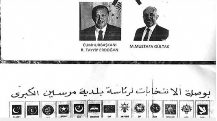 Üzerinde Arapça ‘Büyük Mersin Belediyesi Seçim Pusulas?' yazan pusulada, Büyük?ehir için, Cumhur ittifak? aday? MHP'li Hamit Tuna'ya ve Akdeniz ?lçesi için de AK Parti aday? Mustafa Gültak'a oy verilmesi tarif ediliyor. Pusulada adaylar?n yan?nda Cumhurba?kan? ve AK Parti Genel Ba?kan? Erdo?an'?n foto?raf?n?n da yer ald??? görülüyor.