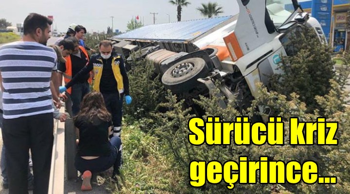 Kaza, ö?le saatlerinde ?zmir- Çanakkale yolu Yeni Foça mevkisinde meydana geldi. Mehmet Ali D., 33 BRT 72 plakal? TIR'? kulland??? s?rada kalp krizi geçirdi. Bu s?rada sürücüsünün direksiyon kontrolünü kaybetti?i TIR, yol kenar?na devrilerek yan yatt?. Di?er sürücülerin ihbar? üzerine kaza yerine jandarma, sa?l?k ve AKS 110 ekipleri sevk edildi. Sa?l?k görevlilerince ilk müdahalesi yap?lan sürücü Mehmet Ali D., ard?ndan Alia?a Devlet Hastanesi'ne kald?r?larak tedaviye al?nd?. Yan yatan TIR'?n kald?r?lmas?n?n ard?ndan trafik normale döndü.