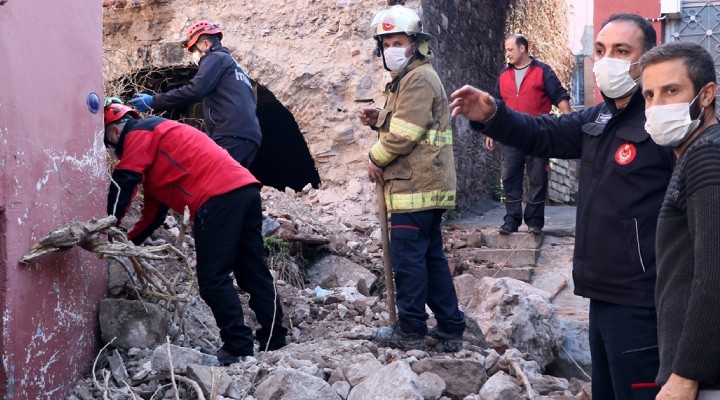 ?hbar üzerine olay yerine gelen itfaiye ve AFAD ekipleri, duvar ta?lar?n?n alt?nda kalan olup olmad???n? kontrol etti.