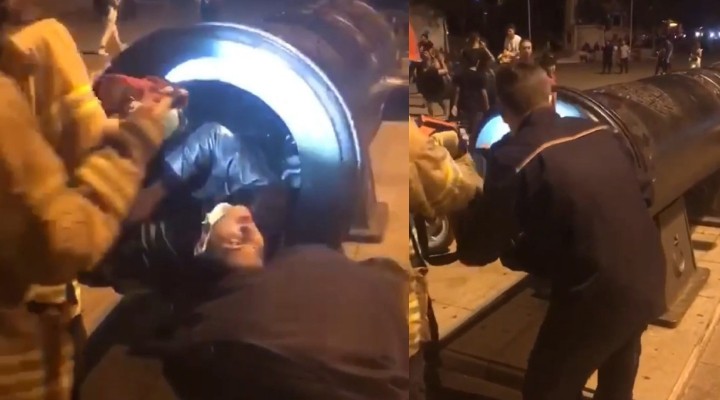Be?ikta?, Barbaros Meydan?'nda sergilenen Osmanl? dönemine ait a??zdan dolma demir kaval topun içine giren bir ki?i burada s?k??t?. Bir süre ç?kmak için çabalayan ki?iyi çevredekiler de ç?karamay?nca itfaiye ekiplerine haber verildi.