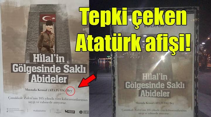 Ahmet Ertan/SONKALE?ZM?R (ÇANAKKALE)-Çanakkale Sava?lar? Gelibolu Tarihi Alan Ba?kanl???’n?n 18 Mart törenleri için bast?rd??? afi?lerde Atatürk’ün yer ald??? resimde, “Mustafa Kemal (Atatürk) Bey” olarak yaz?lmas? tepki çekti. 18 Mart Çanakkale Deniz Zaferi’nin 105’inci y?l dönümü kutlamalar? için Çanakkale Sava?lar? Gelibolu Tarihi Alan Ba?kanl??? afi? bast?rd?. Yer alan afi?lerde Mustafa Kemal Atatürk’ün resminin alt?ndaki unvana ‘Bey’ denilmesi tepki çekti. Çanakkale Belediye Ba?kan? CHP'li Ülgür Gökhan CHP ?l yönetiminin kendisini ziyareti s?ras?nda yapt??? aç?klamada afi?e sert tepki gösterdi.