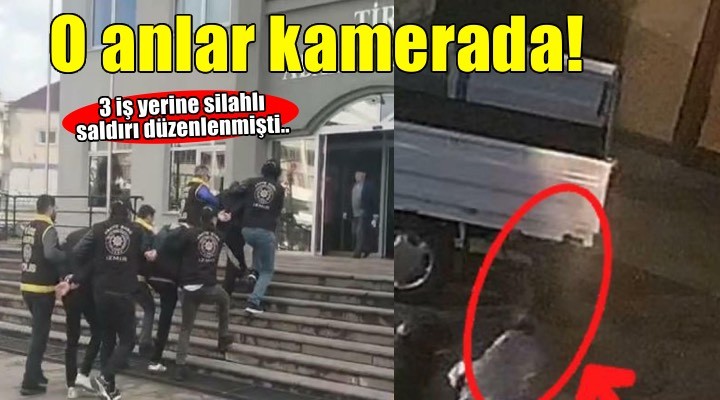 Tire'de 6 Ekim'de S.S. (52), H.E. (40) ve M.S.F.'ye (48) ait 3 i? yerine sald?r? düzenlendi. ?stihbarat ?ube Müdürlü?ü'nün deste?i ile ?zmir Asayi? ?ube Müdürlü?ü'ne ba?l? Gasp Büro Amirli?i, SAM Büro Amirli?i ile Organize Suçlarla Mücadele ?ube Müdürlü?ü ve Tire ?lçe Emniyet Müdürlü?ü ekipleri, çal??ma yapt?. Olaya kar??an ?üphelilerin A.E. (21), A.M.S. (34) ve O.N. (40) oldu?u belirlendi. 21 Ekim'de yap?lan operasyonla ?üpheliler yakaland?. Yap?lan aramalarda olayda kullan?ld??? de?erlendirilen 1 tabanca ele geçirildi. Polisteki i?lemlerinin ard?ndan dün adliyeye sevk edilen ?üpheliler tutukland?. Sald?r? anlar? ise, bir i? yerinin güvenlik kameras?na yans?d?.
