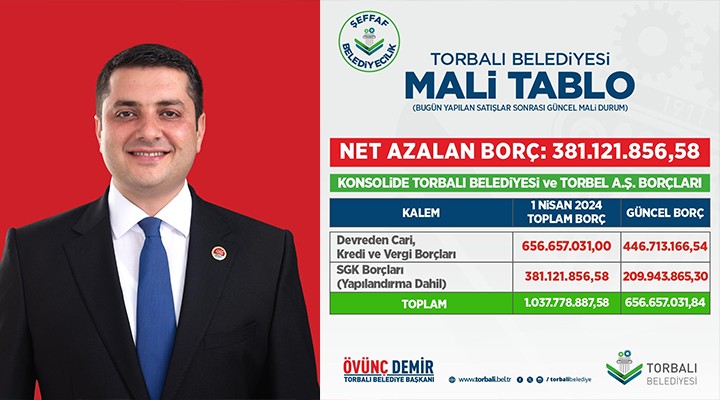 Torbal? Belediye Ba?kan? Övünç Demir, yürütülen bu finansal modelle belediyenin esnaf, sanayici, çiftçi ve i?çiyi güçlendiren bir yap?ya kavu?aca??n? vurgulayarak, “Do?ru yolday?z. Kamucu finans ve bilimsel varl?k yönetimiyle ?ehrimize de?er kataca??z” dedi. Öte yandan belediyenin güncel mali durumunu da payla?an Torbal? Belediyesi, son sat??larla birlikte belediyenin 1 Nisan 2024 itibariyle 381 milyon 121 bin 856 liral?k bir borcun azald???n? duyurdu.
